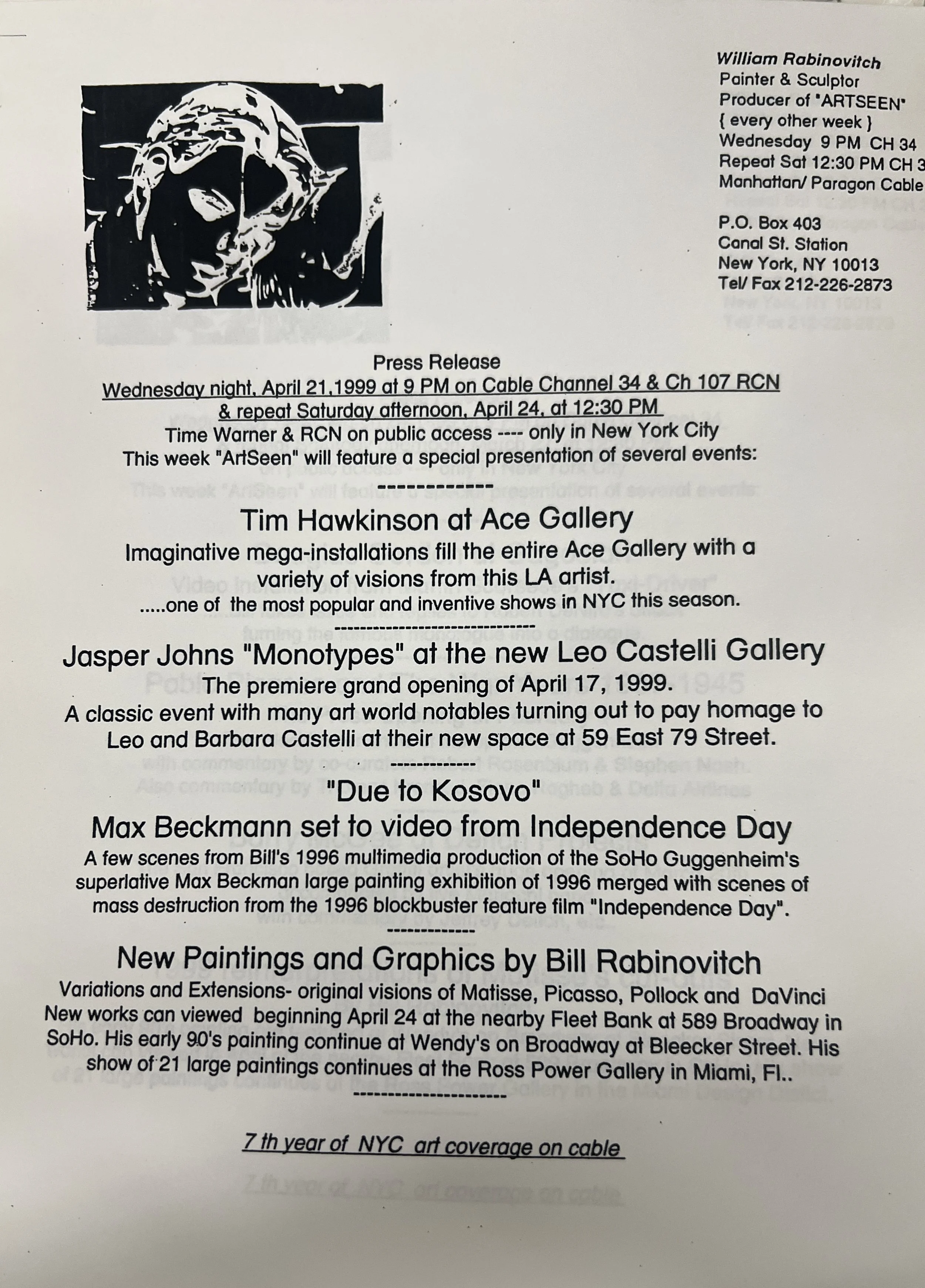 MultimediaSince the early 80s, Bill was documenting the NYC art seen. He attended galleries, interviewed artists, critics, and curators. From 1992-2002 his show “Art Seen” aired on cable TV. Link to Bills Youtube